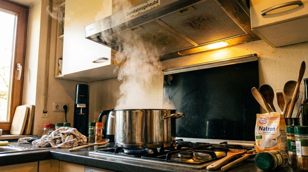 Die Wirkung ist verblüffend. Wenn Sie die Dunstabzugshaube reinigen mit Natron, nutzen Sie einen natürlichen Fettlöser, der die Struktur der Lipide aufbricht. Das Natron im Dampf reagiert mit dem Fett und macht es wasserlöslich.